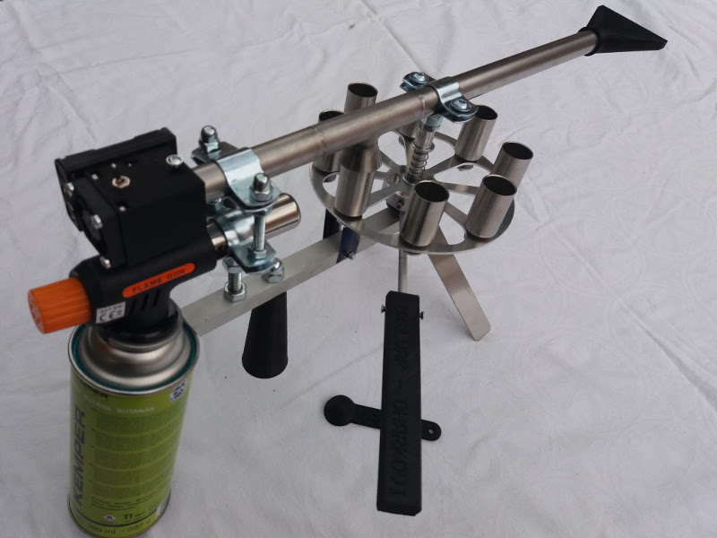 VarroJet es wird mit Gas aus einer Bajonettkartusche erhitzt. Es ist mit einem rotierenden Karussell mit Bechern für 6 oder 8 Bienenstöcke ausgestattet. Eine Tasse wird für eine Dosis Säure pro Bienenvolk verwendet.